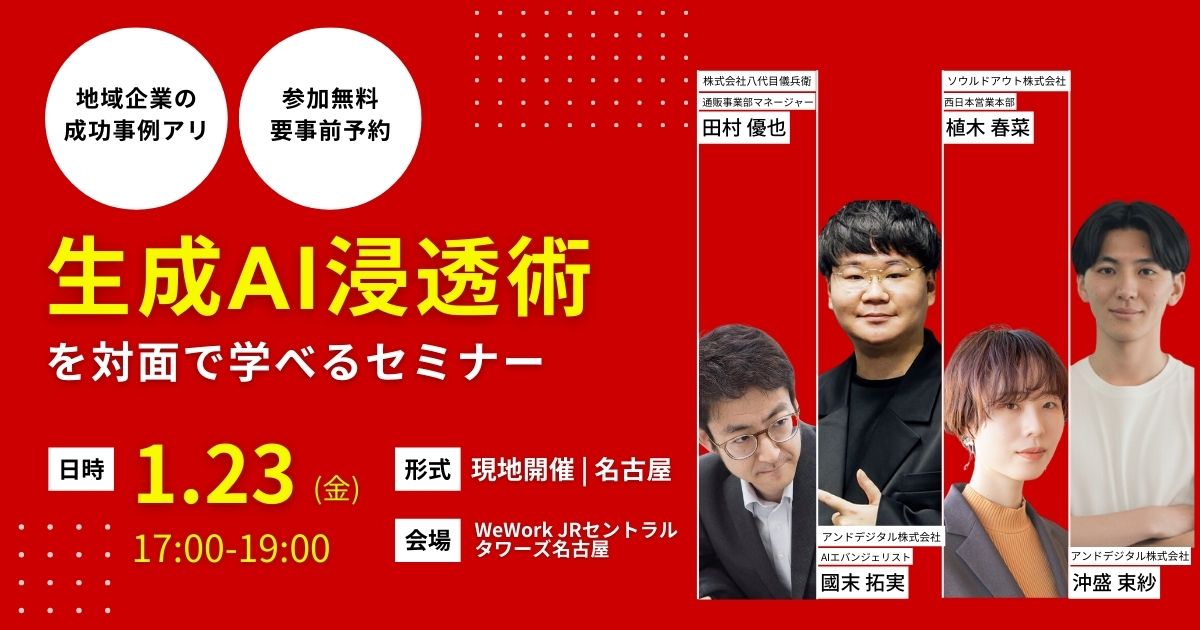 アンドデジタル株式会社(本社:東京都文京区 代表取締役:津田 翔平)とソウルドアウト株式会社は、現在進行中の「ローカル×AI 中堅・中小企業のための生成AIセミナー全国キャラバン」4カ所目のセミナーを、2026年1月23日(金)に名古屋にて開催いたします。
